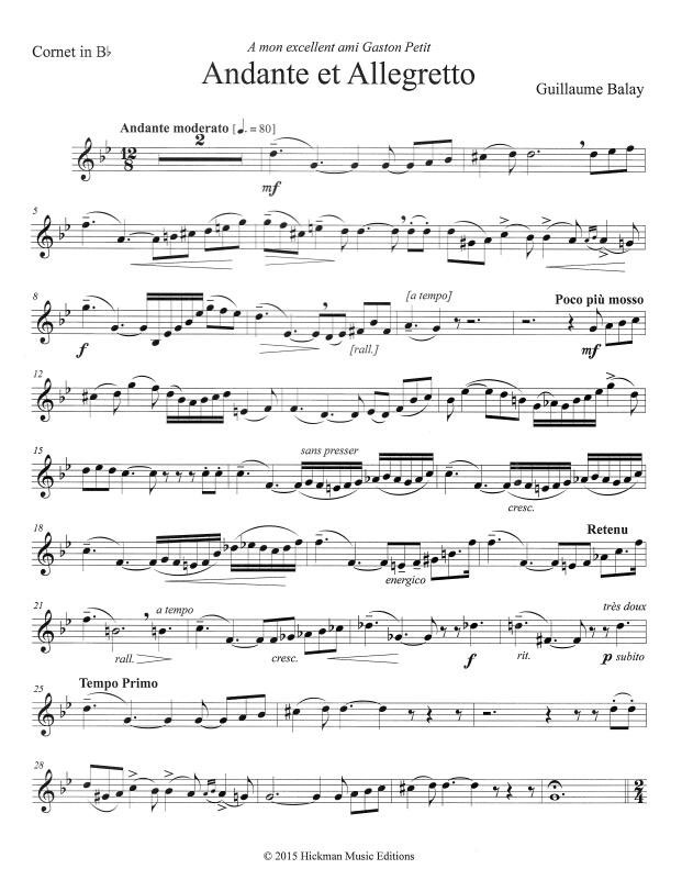 Like Balay’s other wonderful cornet solos, Andante et Allegretto is a beautifully lyric and playful work worthy of any student or professional recital. A perfect solo for high school contests or college recitals! Difficulty Level: III Duration: 4:00 B-flat cornet (or trumpet) and piano. (Recording by David Hunsicker, trumpet; Gene Philley, piano.)