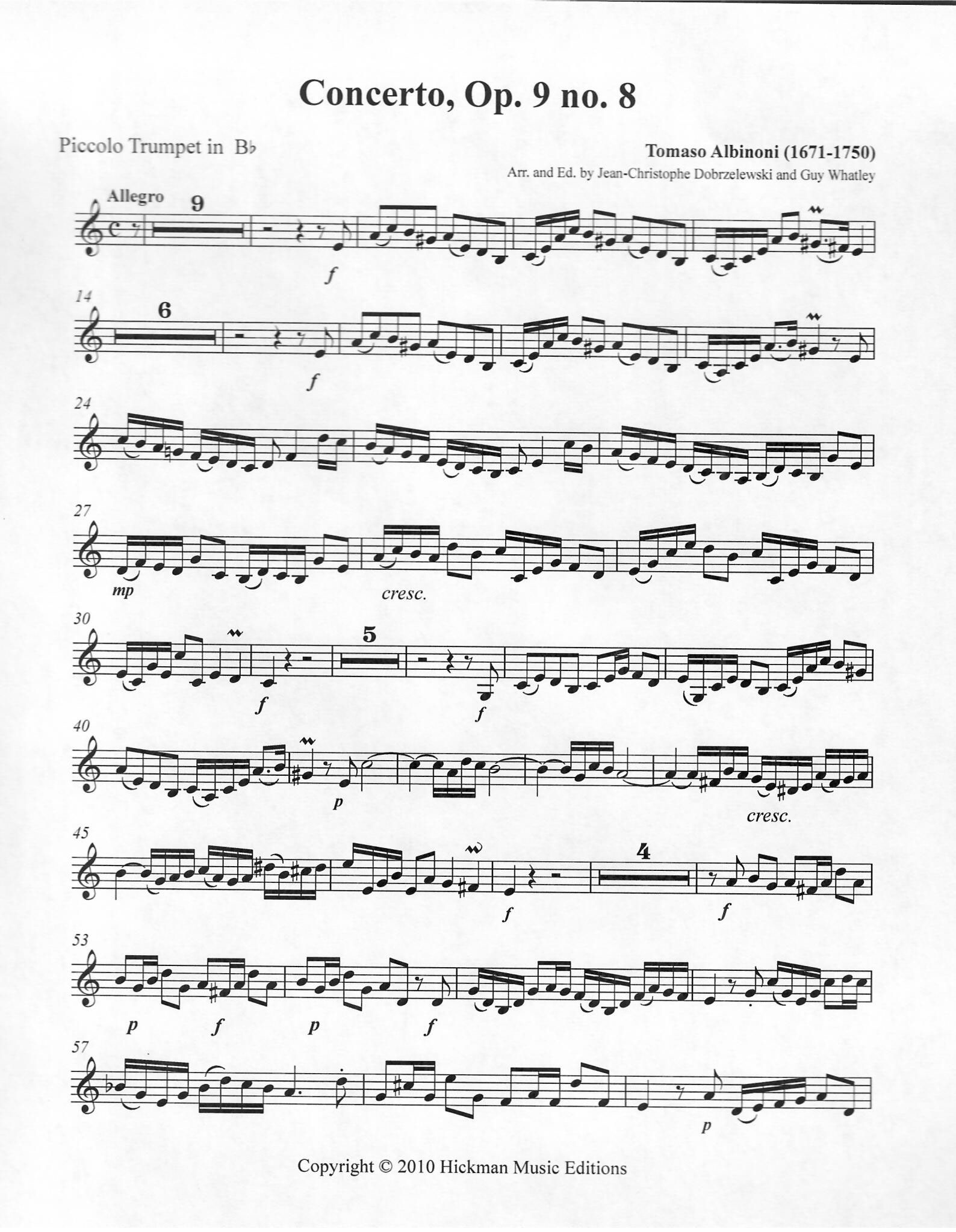 A technically brilliant work for piccolo B-flat trumpet and organ or piano. Originally for oboe and strings, this transcription suits the piccolo trumpet very well, and is a beautiful and challenging work. Difficulty: V+ Duration: ca. 8:00